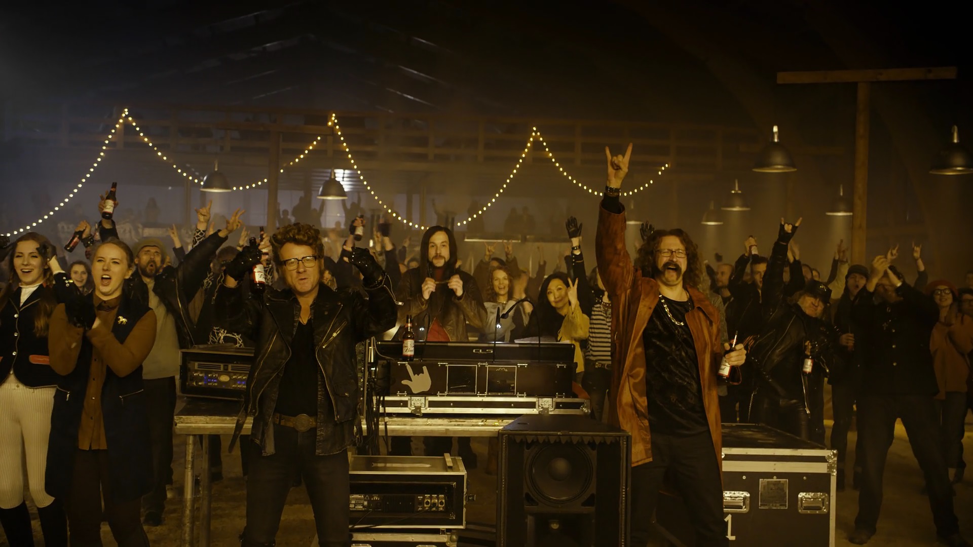 Friends drink in a bar, then a concert with horses on the stage starts. Close-ups change with general plans of a crowd on a concert with flashes of light. |