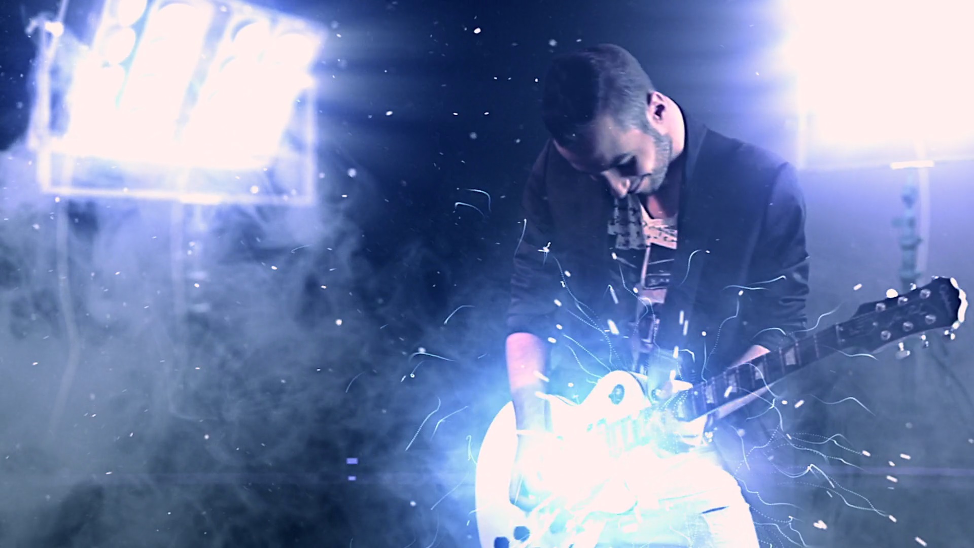 A part of a music clip with red sparkles, grain and double exposure effects. |